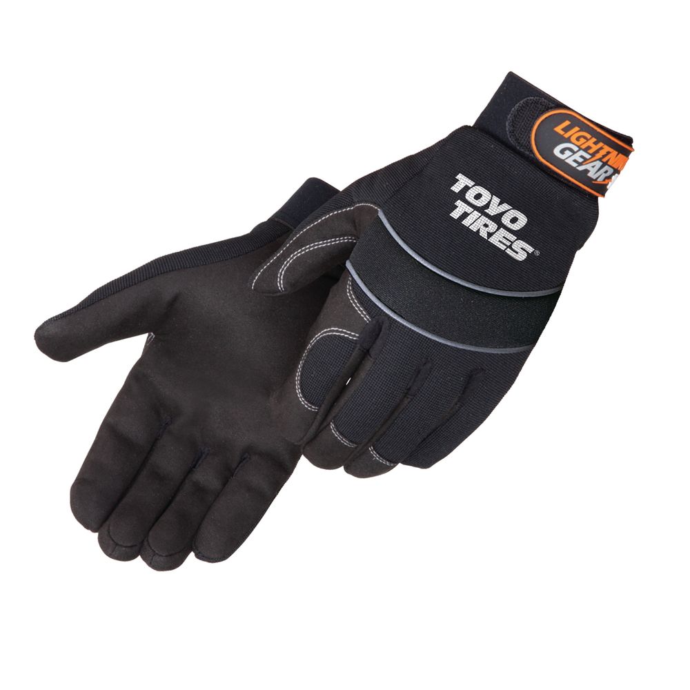Premium simulated black leather palm. Spandex fabric back. Elastic wrist with adjustable hook & loop strap with Lightning Gear logo patch.